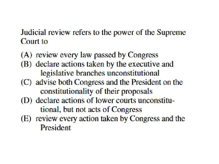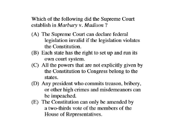 Judicial review. A. Power of courts to strike down laws or governmental actions. B Not explicitly provided for in Const. , but Const. written in broad terms ---> need for interpretation ---> this most logically falls to the courts. C. Established by Marbury v. Madison, 1803: 1. Facts of case: the end of Federalist control of govt. and appointment of the "midnight judges, " including Marbury ---> Jefferson ordered Madison to not deliver commissions to these judges --->Marbury's request for a writ of mandamus (under Sect. 13 of Jud. Act. of 1789) from the Supreme Court to order the delivery of his commission. 2. Decision of Marshall and the Court: section 13 of Judiciary Act of 1789 enabling the Court to issue a writ of mandamus through original jurisdiction in this type of case was unconstitutional.
