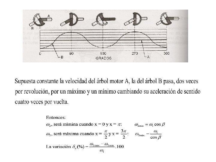 2. Las trayectorias seguidas por las extremidades de las horquillas son siempre circulares. 3. El eje impulsado tiene velocidades angulares no uniformes que varía con la velocidad angular del impulsor. 4. Los engranajes de la caja de velocidad y reductor final están sometidos, por el hecho de estas variaciones de velocidad angular, esfuerzos alternos que aumenta su fatiga.
