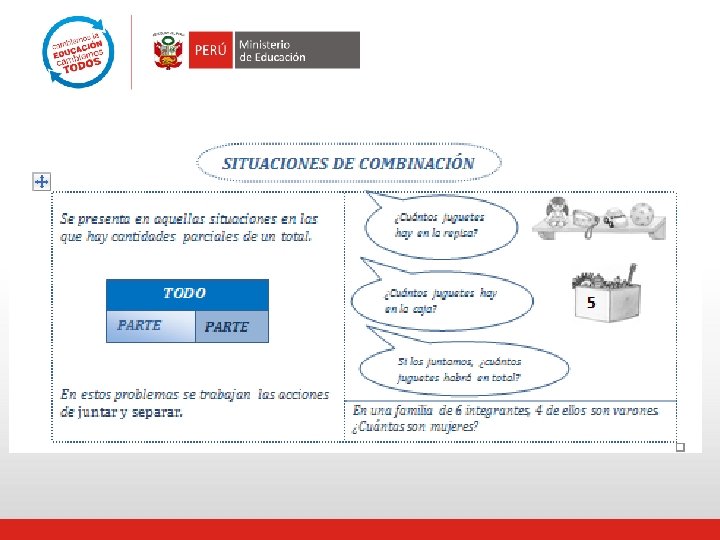LA CATEGORÍA DE COMBINACIÓN (8 años). Es el problema inverso al anterior, puesto que se conoce el todo y una de las partes, y se pregunta por la otra. Es un problema conmutativo y de restar: 5 9 Se conoce el todo y una de las partes. Se pregunta por la otra. ? üEn un corral hay 14 vacas; 8 están echadas y el resto están paradas ¿Cuántas vacas están paradas? ü Juana tiene 9 chupetines contando los rellenos y los normales. Si tiene 5 rellenos ¿Cuántos chupetines normales tiene Juana? üEn clase hay 14 estudiantes; 6 son niños y el resto niñas ¿Cuántas niñas hay?