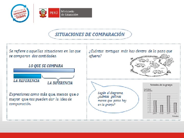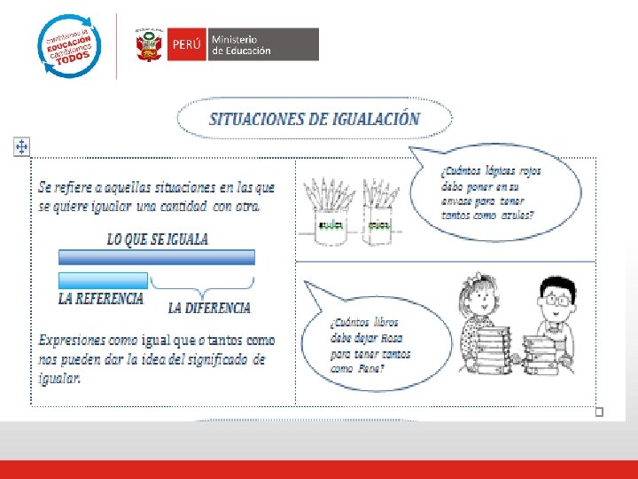 Los problemas de igualación podrían tener un grado de complejidad similar o incluso mayor que los de comparación. No obstante, es necesario precisar que los grupos establecidos no son estáticos ni determinantes. Existen otros factores como el contexto, soporte gráfico, forma de presentar el enunciado, la presencia de datos adicionales, el rango numérico, entre otros, que pueden hacer que la complejidad señalada varíe. Así mismo, queremos señalar que no se debe asociar los grupos de complejidad de los PAEV con grados de escolaridad.