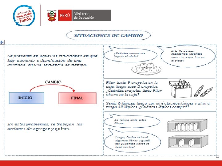 LA CATEGORÍA DE CAMBIO Cambio – Unión (6 años). Se parte de una cantidad inicial a la que se hace crecer. Se pregunta por la cantidad final resultante de la misma naturaleza. Es un problema de sumar. +4 CA 1 5 ? Se conoce cantidad inicial. Se le hace crecer. Se pregunta por la cantidad final. üJuana tenía en su canasta 8 manzanas. Después de recoger, puso otras 14 manzanas. ¿cuántas manzanas tiene ahora en su canasta? üLucho tenía 5 canicas antes de comenzar el juego, al finalizar el juego sus amigo le dan 4 más. ¿Cuántas canicas tiene ahora Lucho?