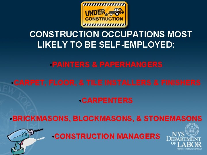 CONSTRUCTION OCCUPATIONS MOST LIKELY TO BE SELF-EMPLOYED: • PAINTERS & PAPERHANGERS • CARPET, FLOOR, & TILE INSTALLERS & FINISHERS • CARPENTERS • BRICKMASONS, BLOCKMASONS, & STONEMASONS • CONSTRUCTION MANAGERS