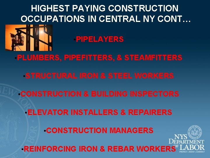 HIGHEST PAYING CONSTRUCTION OCCUPATIONS IN CENTRAL NY CONT… • PIPELAYERS • PLUMBERS, PIPEFITTERS, & STEAMFITTERS • STRUCTURAL IRON & STEEL WORKERS • CONSTRUCTION & BUILDING INSPECTORS • ELEVATOR INSTALLERS & REPAIRERS • CONSTRUCTION MANAGERS • REINFORCING IRON & REBAR WORKERS