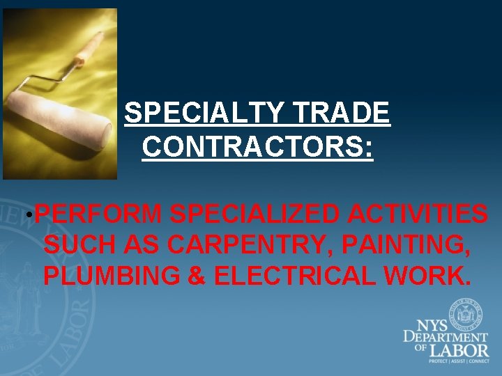 SPECIALTY TRADE CONTRACTORS: • PERFORM SPECIALIZED ACTIVITIES SUCH AS CARPENTRY, PAINTING, PLUMBING & ELECTRICAL WORK.