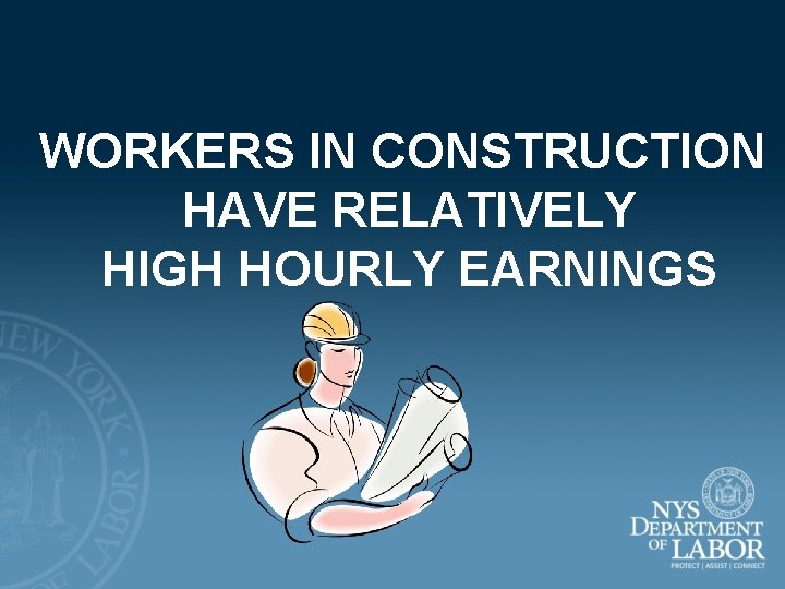 LARGEST CONSTRUCTION OCCUPATIONS IN NY STATE: • CARPENTERS • CONSTRUCTION LABORERS • ELECTRICIANS • PLUMBERS, PIPEFITTERS, & STEAMFITTERS • FIRST-LINE SUPERVISORS/MANAGERS OF CONSTRUCTION TRADES & EXTRACTION WORKERS • CONSTRUCTION MANAGERS