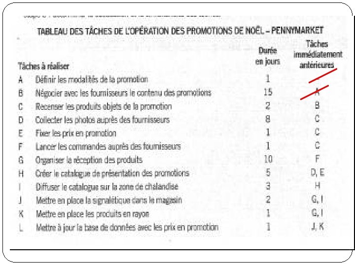 5ème étape de réalisation Établir le tableau des rangs dans l’exécution des tâches Placer au rang 2 toutes les tâches qui se retrouvent maintenant sans tâche immédiatement antérieure Et ainsi de suite jusqu’à la fin.