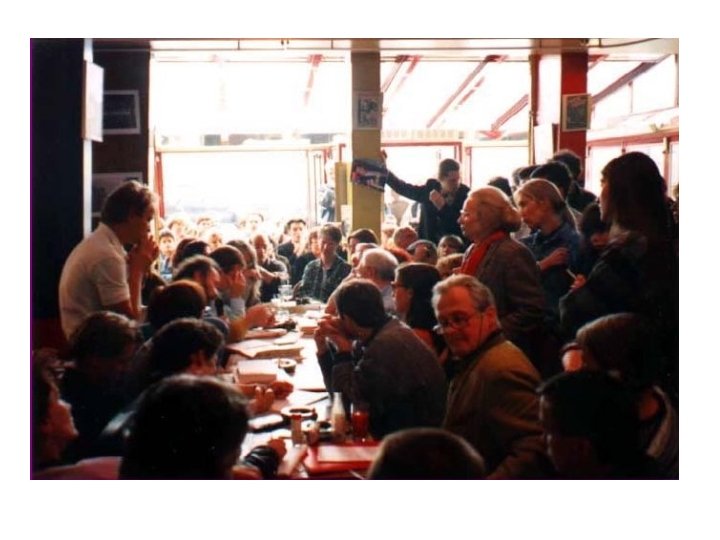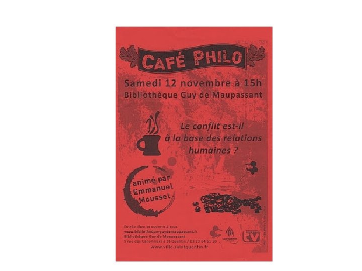 • En 1992, Marc Sautet initiait le premier « café philo » au café « des Phares » , place de la Bastille à Paris. • A cette époque, nous étions, tout au plus, une quinzaine de participants. Aujourd’hui, chaque grande ville de France a son ou ses « cafés philos » . • Le mouvement s’est depuis internationalisé et en 2002, le premier colloque international des « cafés philos » s’est tenu à Noisy-Le-Grand. Les débuts furent, bien sûr contestés. Les universitaires rigoristes renvoyaient cette pratique aux discussions de comptoir, au café du commerce, pensant savoir à eux seuls ce que philosopher veut dire.
