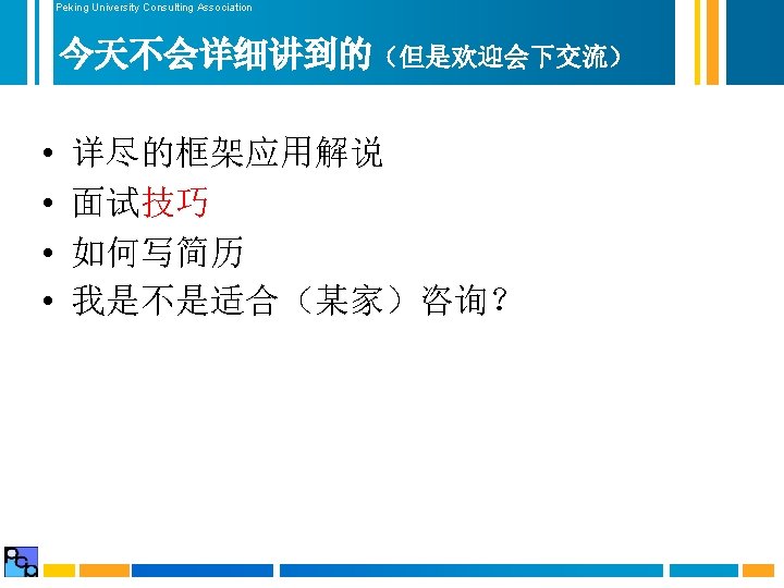 Peking University Consulting Association 案例面试 • 记笔记、问问题、定框架、给建议 • 书面案例 • 面试官的角度 • Drive towards a recommendation
