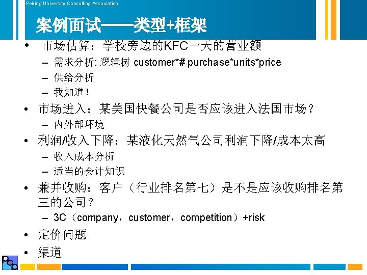 Peking University Consulting Association 案例面试 • 什么是案例面试 IPR-HBS casebook The case is usually a business situation where the client is facing a difficult problem with the company/product/competitors or is thinking of a new opportunity to explore and asks you to help address some of the issues. The case can be a problem, a situation, a riddle, an example of a real client situation, a contrived scenario, or a game—all rapped up into one • 为什么要用案例 – 简单明了地体现逻辑分析能力、表达能力 • 案例类型 – 书面、口头(互动) – 内容 +框架