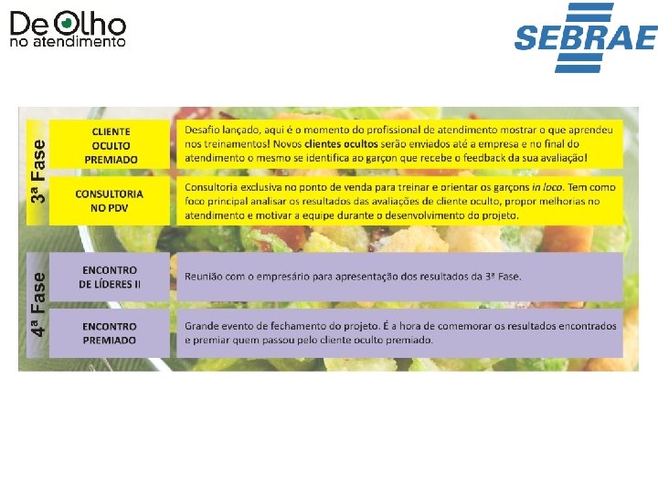 FASES DO PROJETO Diagnóstico: 10 dias Cliente oculto avaliador: 2 avaliações por empresa (20 dias) Encontro de Líderes I: 3 horas Encontro Especial: 3 horas (2 Turmas) Treinamento das Senhas: 3 horas (4 Turmas) Game ASDAC: 3 horas (3 Turmas) Cliente oculto premiado: 6 avaliações Consultoria: 1 hora de visita no ponto de venda quinzenalmente após os treinamentos (2 visitas) • Encontro de Lideres II: 1 hora (Agendamento individual) • Encontro Especial: 3 horas • • *todos os eventos serão no SEBRAE