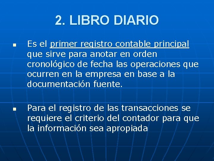 2. LIBRO DIARIO n n Es el primer registro contable principal que sirve para anotar en orden cronológico de fecha las operaciones que ocurren en la empresa en base a la documentación fuente. Para el registro de las transacciones se requiere el criterio del contador para que la información sea apropiada