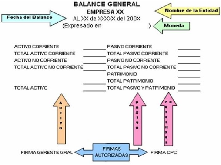 El Balance general debe contener los siguientes datos: ENCABEZADO 1. Nombre de la empresa o nombre del propietario. 2. Indicación de que se trata de un Balance general. 3. Fecha de formulación.