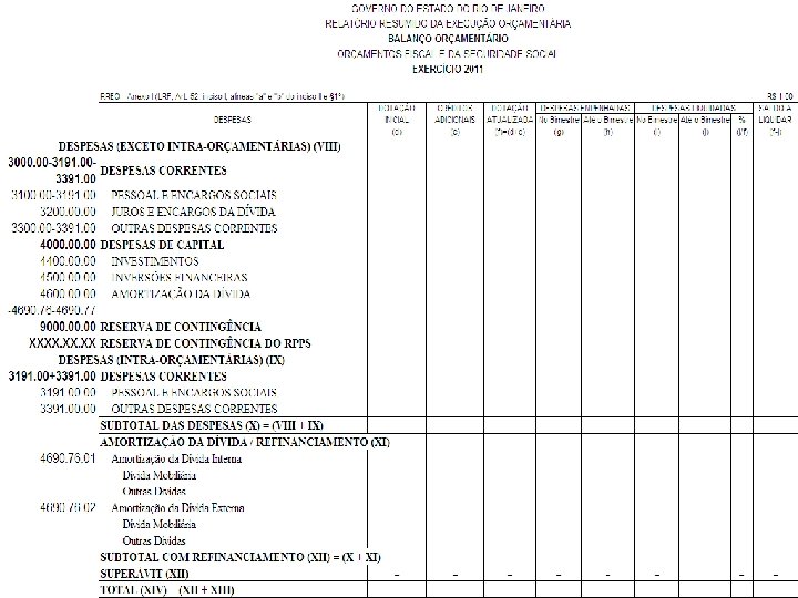 Contadoria Geral do Estado Superintendência de Análise e Relatórios Gerenciais RELATÓRIO RESUMIDO DE EXECUÇÃO ORÇAMENTÁRIA - RREO ANEXO I – BALANÇO ORÇAMENTÁRIO Permite verificar a capacidade de planejamento do Estado, ou seja, a comparação do que foi previsto e realizado nas receitas. A comparação entre a despesa fixada e a despesa realizada. Esse demonstrativo destaca o refinanciamento da dívida mobiliária e o refinanciamento de outras dívidas, detalhadas por categoria econômica, subcategoria econômica, fonte e grupo de natureza da despesa. Discrimina, ainda, dotação inicial, os créditos adicionais, a dotação atualizada para o exercício, as despesas empenhadas e liquidadas no bimestre e até o bimestre atual, e o saldo a liquidar.