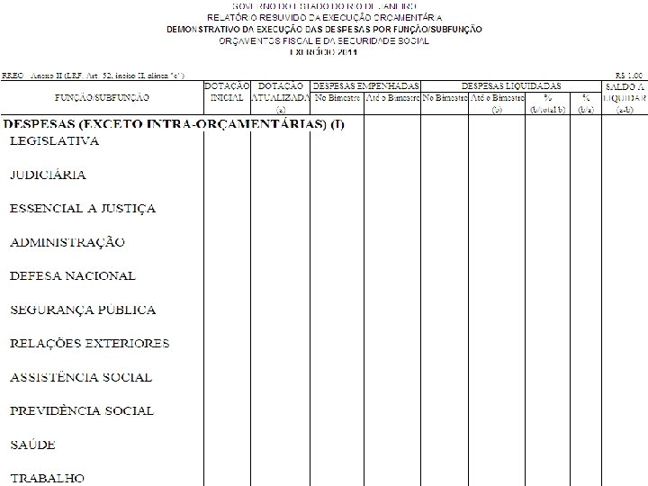 Contadoria Geral do Estado Superintendência de Análise e Relatórios Gerenciais RELATÓRIO RESUMIDO DE EXECUÇÃO ORÇAMENTÁRIA - RREO ANEXO II – DEMONSTRATIVO DA EXECUÇÃO DAS DESPESAS POR FUNÇÃO/SUBFUNÇÃO Apresenta as despesas por função nos diversos níveis de informação. A função expressa o maior nível de agregação na Administração Pública nas diversas áreas da despesa que competem ao setor público. As subfunções representam uma partição da função, visando agregar determinado subconjunto de despesa do setor público. Ex. : Função: Legislativa Ex. : Subfunção: Ação Legislativa Comunicação Social Ex. : Função: Judiciária Ex. : Subfunção: Ação Judiciária Controle Interno Despesa da Ordem Jurídica