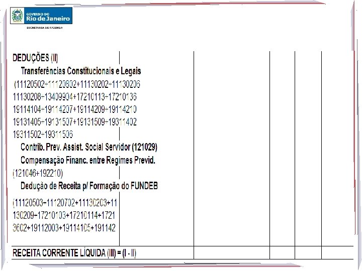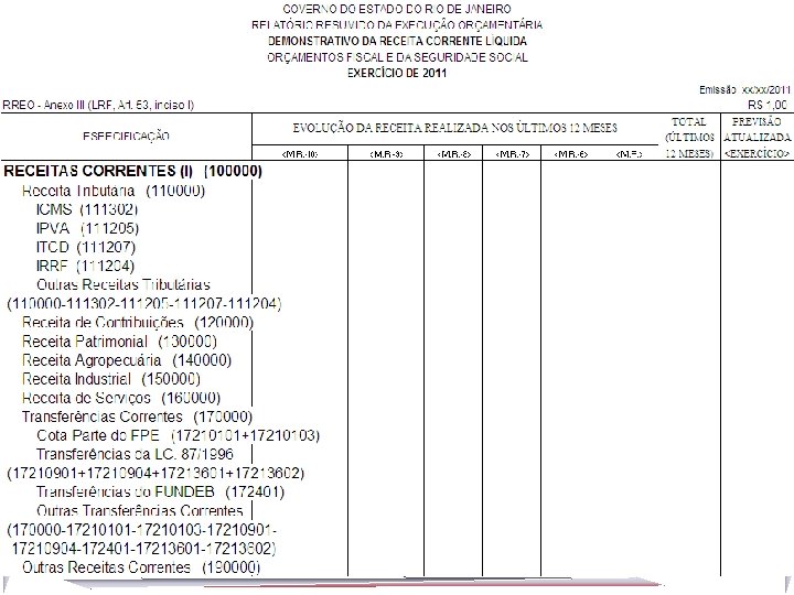 Contadoria Geral do Estado Superintendência de Análise e Relatórios Gerenciais RELATÓRIO RESUMIDO DE EXECUÇÃO ORÇAMENTÁRIA – RREO ANEXO III – DEMONSTRATIVO DA RECEITA CORRENTE LIQUIDA Traz o somatório da receita corrente, sua evolução nos últimos doze meses, assim como a previsão de seu desempenho no exercício, excluído as duplicidades (Transferência aos Municípios, Contribuição do Servidor ao RPPS, Compensação Financeira entre o RGPS e o RPPS e Transferências ao FUNDEB). O principal objetivo da RCL é servir de parâmetro para o montante da reserva de contingência, cuja forma de utilização e montante serão estabelecidos na LDO, e para os limites da despesa total com pessoal, da dívida consolidada líquida, das operações de crédito, do serviço da dívida, das operações de crédito por antecipação de receita orçamentária e das garantias do ente da Federação. Os limites foram estabelecidos pela Lei de Responsabilidade Fiscal – LRF, e pelas Resoluções 40/2001, 43/2001 e 48/2007 do Senado Federal. Conforme a LRF, a RCL é o somatório das receitas tributárias, de contribuições, patrimoniais, agropecuárias, industriais, de serviços, transferências correntes e outras receitas correntes do ente da Federação, deduzidos alguns itens exaustivamente explicitados pela própria LRF, não cabendo interpretações que extrapolem os dispositivos legais.