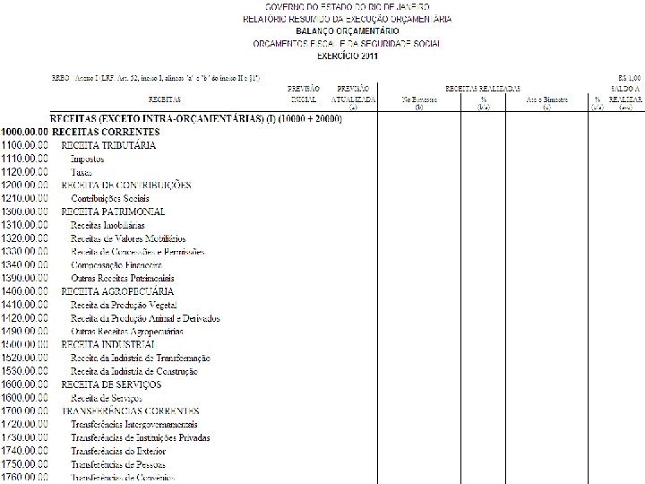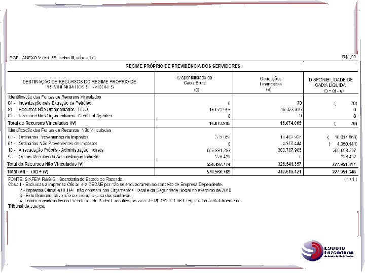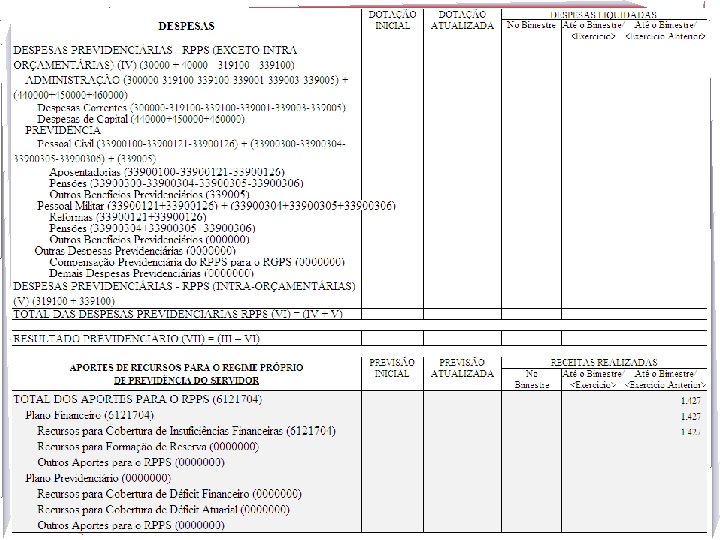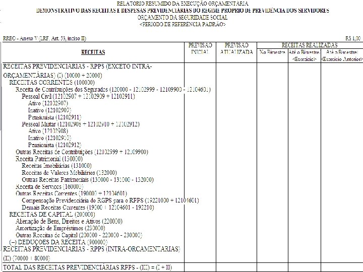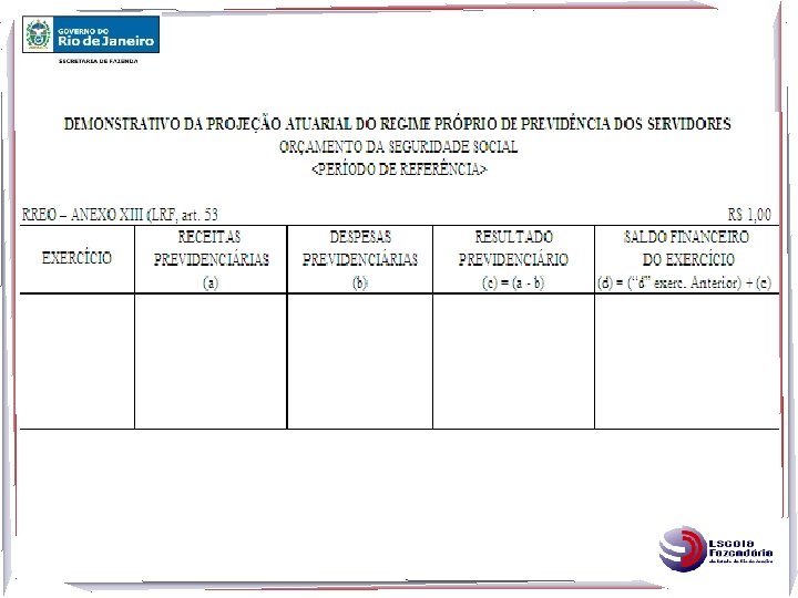 Contadoria Geral do Estado Superintendência de Análise e Relatórios Gerenciais RELATÓRIO RESUMIDO DE EXECUÇÃO ORÇAMENTÁRIA – RREO ANEXO V – DEMONSTRATIVO DAS RECEITAS E DESPESAS PREVIDENCIÁRIAS DO REGIME PRÓPRIO DE PREVIDÊNCIA DOS SERVIDORES Demonstra as receitas previdenciárias recolhidas dos servidores para o custeio do Regime Próprio de Previdência Social (RPPS) e as despesas estimadas com benefícios previdenciários, a serem desembolsados, resultando numa avaliação financeira e atuarial do Regime Próprio de Previdência Social (RPPS). O demonstrativo deverá evidenciar, também, os repasses recebidos para cobertura de déficits, quando houver. O Rioprevidência é a autarquia responsável pela habilitação, administração e pagamento dos benefícios previdenciários previstos na legislação estadual que dispõe sobre o regime previdenciário dos servidores públicos do Estado do Rio de Janeiro e seus dependentes.