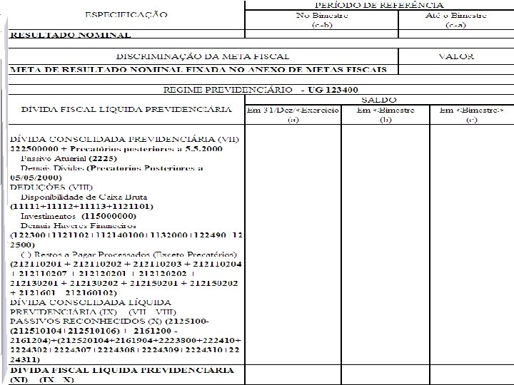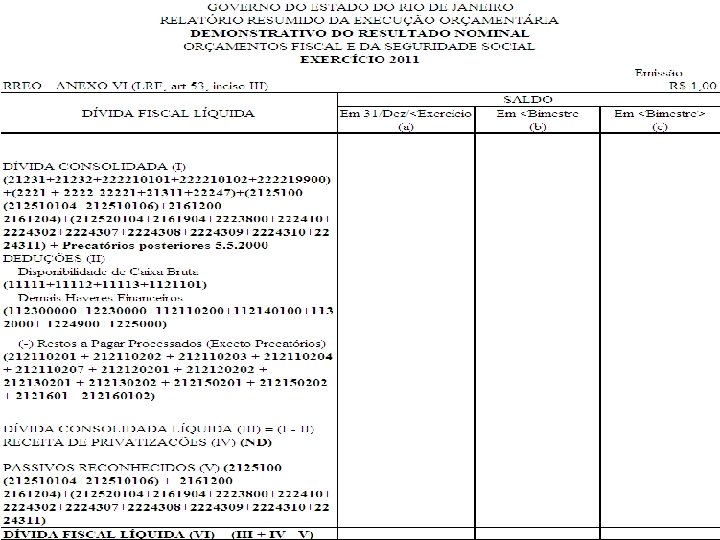 Contadoria Geral do Estado Superintendência de Análise e Relatórios Gerenciais RELATÓRIO RESUMIDO DE EXECUÇÃO ORÇAMENTÁRIA – RREO ANEXO VI – DEMONSTRATIVO DO RESULTADO NOMINAL O objetivo da apuração do Resultado Nominal é medir a evolução da Dívida Fiscal Líquida. O saldo da dívida fiscal líquida corresponde ao saldo da dívida consolidada líquida somado às receitas de privatização, deduzidos os passivos reconhecidos, decorrentes de déficits ocorridos em exercícios anteriores. A dívida consolidada líquida corresponde ao saldo da dívida consolidada, deduzida do Ativo Disponível e dos Haveres Financeiros, líquidos Restos a Pagar Processados, conforme estabelece o art. 42 da LRF, em seu parágrafo único: "Na determinação da disponibilidade de caixa serão considerados os encargos e despesas compromissadas a pagar (RPP) até o final do exercício". O Resultado Nominal equivale ao aumento/redução da dívida pública em um determinado período. É a diferença entre as receitas e as despesas públicas, incluindo receitas e despesas financeiras