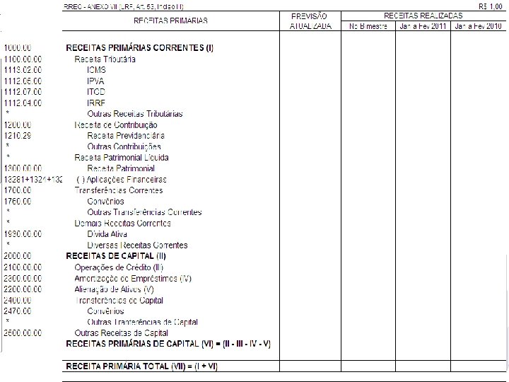 Contadoria Geral do Estado Superintendência de Análise e Relatórios Gerenciais RELATÓRIO RESUMIDO DE EXECUÇÃO ORÇAMENTÁRIA – RREO ANEXO VII – DEMONSTRATIVO DO RESULTADO PRIMÁRIO Representa o somatório das receitas fiscais líquidas menos as despesas fiscais líquidas. O Resultado Primário é um valor não financeiro, representado pela diferença entre as receitas não financeiras e as despesas não financeiras. Ou seja, indica se os gastos orçamentários do Estado são compatíveis com sua arrecadação. Entendem-se como Receitas Não Financeiras o total das receitas orçamentárias deduzidas as aplicações financeiras, operações de crédito, amortização de empréstimos e alienações de bens. Entendem-se como Despesas Não Financeiras o total das despesas orçamentárias deduzidas as despesas com juros e amortização da divida interna e externa, com a aquisição de títulos de capital integralizado e as despesas com concessão de empréstimos com retorno garantido.