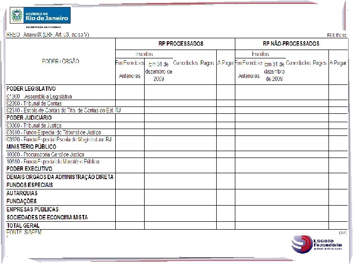Contadoria Geral do Estado Superintendência de Análise e Relatórios Gerenciais RELATÓRIO RESUMIDO DE EXECUÇÃO ORÇAMENTÁRIA – RREO ANEXO IX – DEMONSTRATIVO DOS RESTOS A PAGAR PODER E ÓRGÃO Apresenta os valores inscritos, pagos, cancelados e a pagar. São as obrigações assumidas e constam do Passivo Financeiro do Balanço Patrimonial como Restos a Pagar Processados e Não Processados. Os Restos a Pagar constituem compromissos financeiros exigíveis que compõem a dívida flutuante e podem ser caracterizados como as despesas empenhadas, mas não pagas até o dia 31 de dezembro de cada exercício financeiro. As despesas empenhadas, não pagas até o dia 31 de dezembro, não canceladas pelo processo de análise e depuração e, que atendam os requisitos previstos em legislação específica, devem ser inscritas em Restos a Pagar, pois se referem a encargos incorridos no próprio exercício. São considerados processados os Restos a Pagar referentes a empenhos liquidados e, portanto, prontos para o pagamento, ou seja, cujo direito do credor já foi verificado. Em via contrária, são considerados nãoprocessados os empenhos de contrato e convênios que se encontram em plena execução, não existindo o direito líquido e certo do credor.