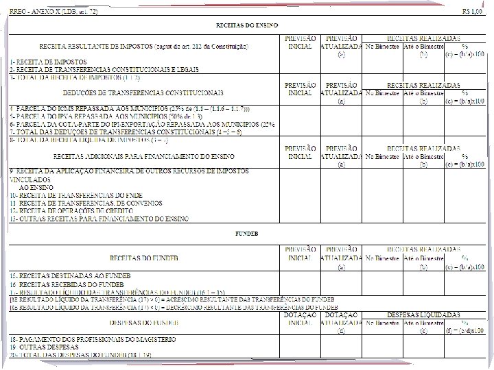 Contadoria Geral do Estado Superintendência de Análise e Relatórios Gerenciais RELATÓRIO RESUMIDO DE EXECUÇÃO ORÇAMENTÁRIA – RREO ANEXO X – DEMONSTRATIVO DAS RECEITAS E DESPESAS COM MANUTENÇÃO E DESENVOLVIMENTO DO ENSINO – MDE O Demonstrativo das Receitas e Despesas com Manutenção e Desenvolvimento do Ensino – MDE apresenta os recursos públicos destinados à educação, provenientes da receita resultante de impostos e das receitas vinculadas ao ensino, as despesas com a MDE por vinculação de receita, os acréscimos ou decréscimos nas transferências do Fundo de Manutenção e Desenvolvimento da Educação Básica e de Valorização dos Profissionais da Educação – FUNDEB, o cumprimento dos limites constitucionais e outras informações para controle financeiro. A apresentação deste demonstrativo está prevista no ordenamento jurídico. O art. 72 da Lei nº 9. 394/96, Lei de Diretrizes e Bases da Educação Nacional – LDB prevê a publicação nos relatórios expressos na Constituição. O art. 165 da Constituição determina a publicação até trinta dias após o encerramento de cada bimestre do Relatório Resumido da Execução Orçamentária. Adicionalmente, o art. 52 da Lei Complementar nº 101, de 2000, Lei de Responsabilidade Fiscal – LRF, reafirma o prazo de publicação e informa a sua abrangência. Proporção não inferior a 60% (sessenta por cento) do FUNDEB será destinada ao pagamento dos profissionais do magistério da educação básica em efetivo exercício.