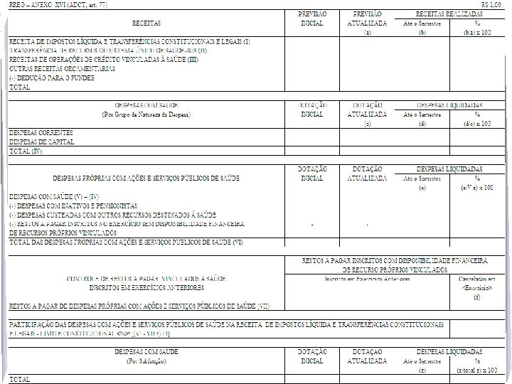 Contadoria Geral do Estado Superintendência de Análise e Relatórios Gerenciais RELATÓRIO RESUMIDO DE EXECUÇÃO ORÇAMENTÁRIA – RREO ANEXO XVI – DEMONSTRATIVO DA RECEITA LÍQUIDA DE IMPOSTOS E DAS DESPESAS PRÓPRIAS COM AÇÕES E SERVIÇOS PÚBLICOS DE SAÚDE O Demonstrativo da Receita Líquida de Impostos e das Despesas Próprias com Ações e Serviços Públicos de Saúde, aplicado aos Estados, ao Distrito Federal e aos Municípios, apresenta a receita de impostos líquida e as transferências constitucionais e legais; as despesas com saúde por grupo de natureza da despesa e por subfunção; as transferências de recursos do Sistema Único de Saúde – SUS, provenientes de outros entes federados, e a participação das despesas com saúde na receita de impostos líquida e transferências constitucionais e legais, com a finalidade de demonstrar o cumprimento da aplicação dos recursos mínimos, nas ações e serviços públicos de saúde de acesso universal, previstos na Constituição. Esse demonstrativo integra o RREO para verificação do cumprimento do disposto na Lei de Responsabilidade Fiscal – LRF e deverá ser publicado até trinta dias após o encerramento do 3º e 6º bimestres.