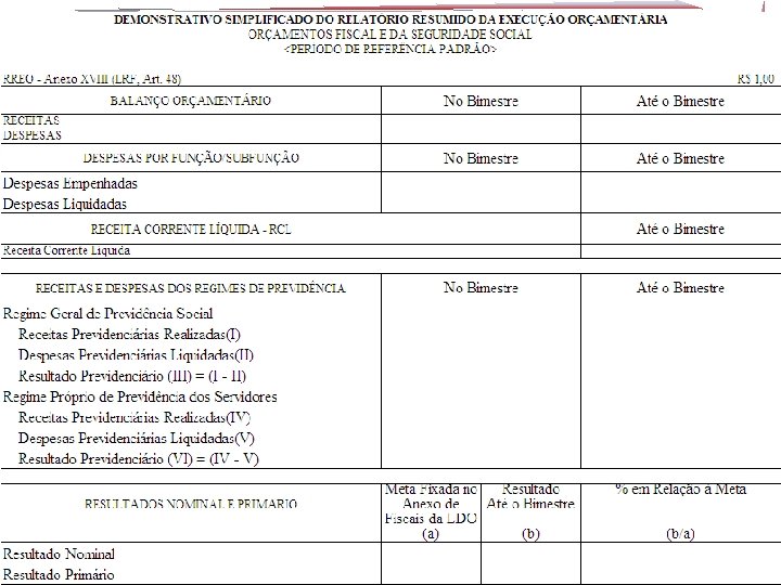 Contadoria Geral do Estado Superintendência de Análise e Relatórios Gerenciais RELATÓRIO RESUMIDO DE EXECUÇÃO ORÇAMENTÁRIA - RREO Os demonstrativos do RREO, listados a seguir, deverão ser elaborados e publicados até trinta dias após o encerramento do bimestre de referência, durante o exercício. a) Balanço Orçamentário; b) Demonstrativo da Execução das Despesas por Função/Subfunção; c) Demonstrativo da Receita Corrente Líquida; d) Demonstrativo das Receitas e Despesas Previdenciárias do Regime Próprio dos Servidores; e) Demonstrativo do Resultado Nominal; f) Demonstrativo do Resultado Primário; g) Demonstrativo dos Restos a Pagar por Poder e Órgão; h) Demonstrativo das Receitas e Despesas com Manutenção e Desenvolvimento do Ensino; i) Demonstrativos das Despesas com Saúde; j) Demonstrativo Simplificado do Relatório Resumido da Execução Orçamentária.