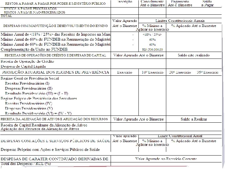 Contadoria Geral do Estado Superintendência de Análise e Relatórios Gerenciais RELATÓRIO RESUMIDO DE EXECUÇÃO ORÇAMENTÁRIA – RREO ANEXO X – DEMONSTRATIVO DAS RECEITAS E DESPESAS COM MANUTENÇÃO E DESENVOLVIMENTO DO ENSINO – MDE Aplicação da Receita em Educação Despesas consideradas para efeito do índice: (+) Despesas executadas na função educação (12), nas Fontes de Recursos vinculadas aos Impostos (00, 01, 06, 07 e 22), excetuadas as despesas que não atendem ao Princípio da Universalidade; (+) Despesas vinculadas ao do FUNDEB (Fonte de Recursos 15), excetuadas as despesas que não atendem ao Princípio da Universalidade; ; (+) Perdas com a constituição do FUNDEB; (-) Cancelamento, no exercício, de Restos a Pagar Processados inscritos com disponibilidade financeira de recursos de impostos vinculados ao ensino; Ao final do exercício considera-se também as despesas empenhadas e liquidadas que possuam disponibilidade financeira.