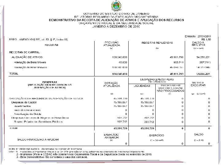 Contadoria Geral do Estado Superintendência de Análise e Relatórios Gerenciais RELATÓRIO RESUMIDO DE EXECUÇÃO ORÇAMENTÁRIA – RREO ANEXO XIV – DEMONSTRATIVO DA RECEITA DE ALIENAÇÃO DE ATIVOS E APLICAÇÃO DOS RECURSOS O Demonstrativo da Receita de Alienação de Ativos e Aplicação dos Recursos apresenta a receita proveniente da alienação de ativos e a correspondente aplicação dos recursos auferidos. É vedada a aplicação da receita de capital derivada da alienação de bens e direitos que integram o patrimônio público, para o financiamento de despesa corrente, salvo se destinada por lei ao Regime Geral de Previdência Social, e ao Regime Próprio de Previdência dos Servidores.