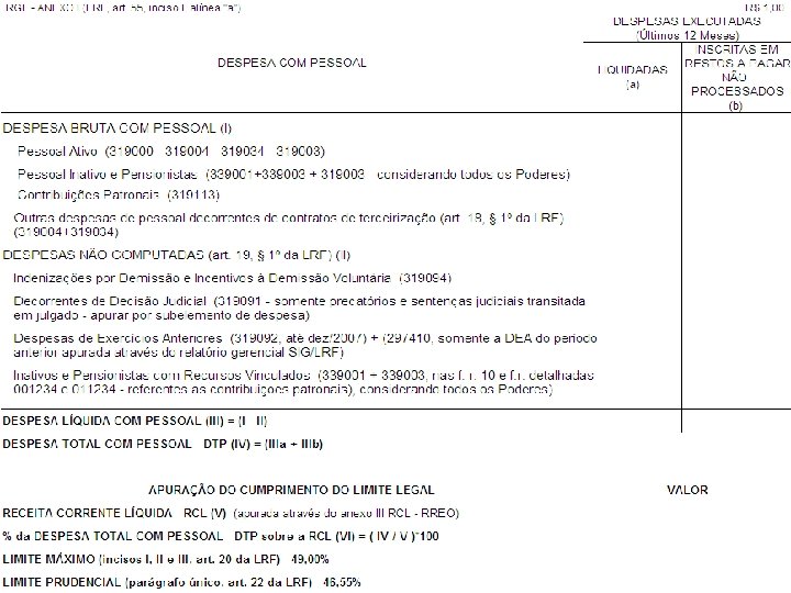 Contadoria Geral do Estado Superintendência de Análise e Relatórios Gerenciais RELATÓRIO DE GESTÃO FISCAL – RGF ANEXO I – DEMONSTRATIVO DA DESPESA COM PESSOAL A LRF determina limite legal de gastos com pessoal em relação à Receita Corrente Líquida (RCL). De acordo com a Lei, a despesa com pessoal dos Estados não pode ultrapassar 60% da RCL, assim distribuídos: a) 3% (três por cento) para o Legislativo, incluído o Tribunal de Contas do Estado; b) 6% (seis por cento) para o Judiciário; c) 49% (quarenta e nove por cento) para o Executivo; d) 2% (dois por cento) para o Ministério Público dos Estados; Existem ainda dois limites de gastos com pessoal. O denominado "limite de alerta", estabelecido em 90% do limite legal. Ou seja, quando o Executivo atingir 44, 10% da RCL, cabe ao Tribunal de Contas alertar sobre o fato. O outro é o "limite prudencial", que chega a 95% do limite legal (46, 55% da RCL). Se o governante verificar que ultrapassou os limites estabelecidos, deve tomar providências para se enquadrar no prazo de 08 meses.