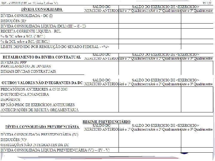 Contadoria Geral do Estado Superintendência de Análise e Relatórios Gerenciais RELATÓRIO DE GESTÃO FISCAL – RGF ANEXO II – DEMONSTRATIVO DA DÍVIDA CONSOLIDADA LÍQUIDA - DCL Visa assegurar a transparência das obrigações contraídas pelo Estado, como também controlar os limites de endividamento de que trata a LRF, ou seja, respeitar a relação entre dívida e sua capacidade de pagamento. Para os Estados, o limite estabelecido pelo Senado Federal é de 2 x RCL. A Dívida Consolidada – DC ou fundada corresponde ao montante total, apurado sem duplicidade, das obrigações financeiras, inclusive as decorrentes de emissão de títulos do ente da Federação, assumidas em virtude de leis, contratos, convênios ou tratados e da realização de operações de crédito para amortização em prazo superior a 12 (doze) meses, dos precatórios judiciais emitidos a partir de 5 de maio de 2000 e não pagos durante a execução do orçamento em que houverem sido incluídos, e das operações de crédito, que, embora de prazo inferior a 12 (doze) meses, tenham constado como receitas no orçamento.