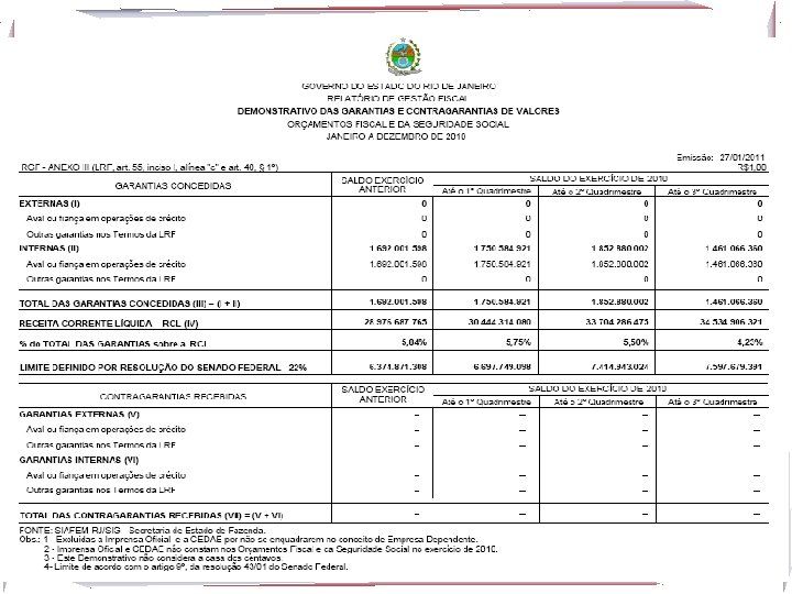 Contadoria Geral do Estado Superintendência de Análise e Relatórios Gerenciais RELATÓRIO DE GESTÃO FISCAL – RGF ANEXO III – DEMONSTRATIVO DAS GARANTIAS E CONTRAGARANTIAS DE VALORES Este demonstrativo visa a assegurar a transparência das garantias oferecidas a terceiros por ente da Federação e verificar os limites de que trata a LRF, bem como das contragarantias vinculadas, decorrentes das operações de crédito internas e externas. Garantia: fianças e avais concedidos pelo ente federativo, em operações de crédito, inclusive com recursos de fundos de aval, a assunção de risco creditício em linhas de crédito, o seguro de crédito à exportação e outras garantias de natureza semelhante que representem compromisso de adimplência de obrigação financeira ou contratual Contragarantia: contrapartida oferecida pelo ente federativo que irá receber uma garantia, de forma que seja em valor igual ou superior ao da garantia a ser concedida, e que abranja o ressarcimento integral dos custos financeiros decorrentes da cobertura de eventual inadimplemento.