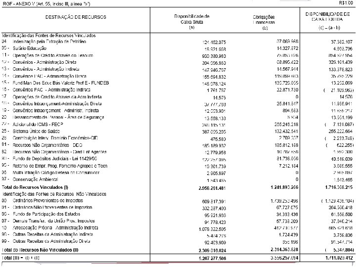 Contadoria Geral do Estado Superintendência de Análise e Relatórios Gerenciais RELATÓRIO DE GESTÃO FISCAL – RGF ANEXO V – DEMONSTRATIVO DA DISPONIBILIDADE DE CAIXA Este demonstrativo visa a dar transparência ao montante disponível para fins da inscrição em Restos a Pagar de despesas não liquidadas, cujo limite, no último ano de mandato da gestão administrativo-financeira, é a disponibilidade de caixa líquida por vinculação de recursos. Para tanto, apresenta o cálculo da Disponibilidade de Caixa do ponto de vista estritamente fiscal, demonstrando se o ente possui liquidez para arcar com seus compromissos financeiros. O Demonstrativo deverá ser elaborado somente no último quadrimestre pelos Poderes e órgãos com poder de autogoverno, tais como o Poder Executivo, os órgãos dos Poderes Legislativo e Judiciário, o Tribunal de Contas e o Ministério Público.