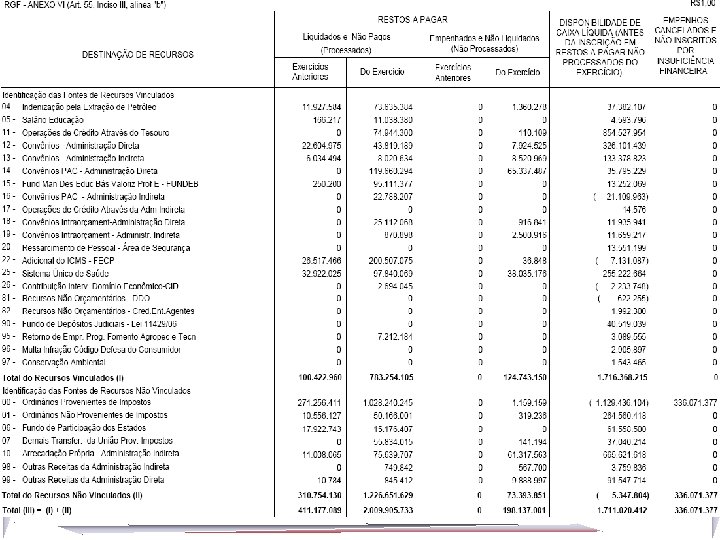 Contadoria Geral do Estado Superintendência de Análise e Relatórios Gerenciais RELATÓRIO DE GESTÃO FISCAL – RGF ANEXO VI – DEMONSTRATIVO DOS RESTOS A PAGAR Este demonstrativo visa assegurar a transparência da inscrição em Restos a Pagar de despesas não liquidadas nos limites de disponibilidade de caixa de que trata a LRF. Nos dois últimos quadrimestres do último ano de mandato, é vedado ao governante contrair obrigação de despesa que não possa ser paga no mesmo exercício. Se isso ocorrer, o governante deverá assegurar disponibilidade de caixa para o exercício seguinte. Os Restos a Pagar constituem compromissos financeiros exigíveis que compõem a dívida flutuante e podem ser caracterizados como as despesas empenhadas, mas não pagas até o dia 31 de dezembro de cada exercício financeiro.