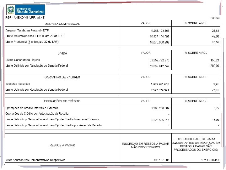 Contadoria Geral do Estado Superintendência de Análise e Relatórios Gerenciais Qual o objetivo da LRF? Melhorar a responsabilidade na gestão fiscal dos recursos públicos. Com ela, todos os governantes passam a se responsabilizar pelo orçamento e pelas metas que possibilitem prevenir riscos e corrigir desvios capazes de afetar o equilíbrio das contas públicas, reforçando os alicerces do desenvolvimento econômico sustentado, sem inflação para financiar o descontrole de gastos do setor público, sem endividamento excessivo e sem a criação de artifícios para cobrir os buracos de uma má gestão fiscal. Quais os entes envolvidos? Executivo, Legislativo, Judiciário, Tribunal de Contas e o Ministério Público, nos níveis federal, estadual e municipal. Como a sociedade pode colaborar para o sucesso da LRF? Através da transparência na gestão pública, todo o cidadão tem o direito de saber onde e como está sendo gasto o dinheiro público. Por esta razão, cada governante terá que publicar o Relatório de Gestão Fiscal (RGF) e o Relatório Resumido de Execução Orçamentária (RREO), em linguagem simples e objetiva.