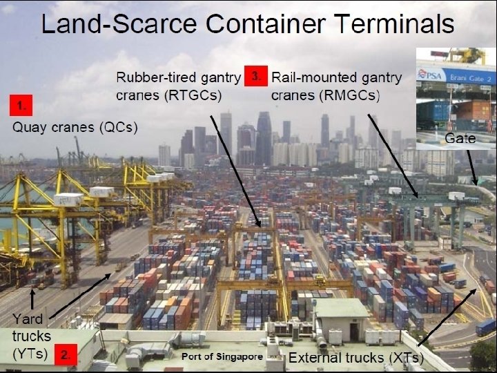 Land-Scarce Container Terminals Cargo stacked up to 7 tiers high in large “blocks” 0 -3 truck traffic lanes between blocks Storage density: 1000 -1200 TEU per hectare Manually operated trucks and cranes No on-dock rail yard Port of singapore Cargo throughput: 2000 -2500 TEU per meter of wharf line per year