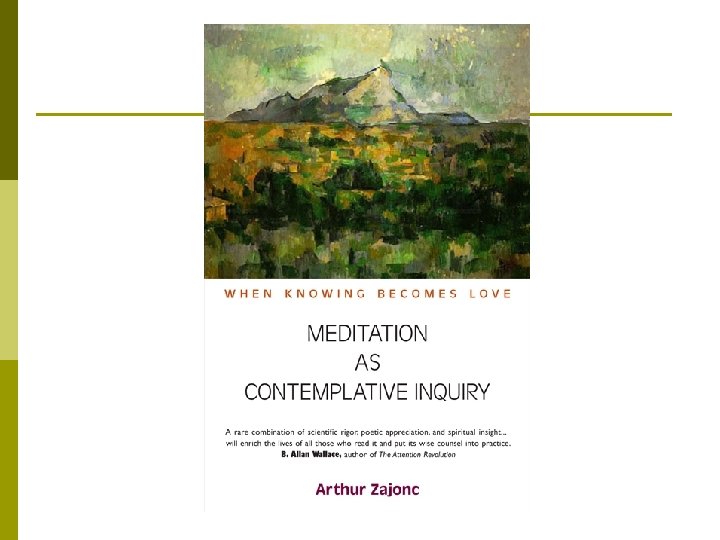 Contemplative Pedagogy Supports and develops the inner resources of the student. p Offers a complementary modality of engagement with texts, natural phenomena, the arts, other cultures, … p Can be deepen to a means of inquiry and insight. p Is practiced by an increasing number of professors, student life councilors and others in the academy. p Research on meditation p