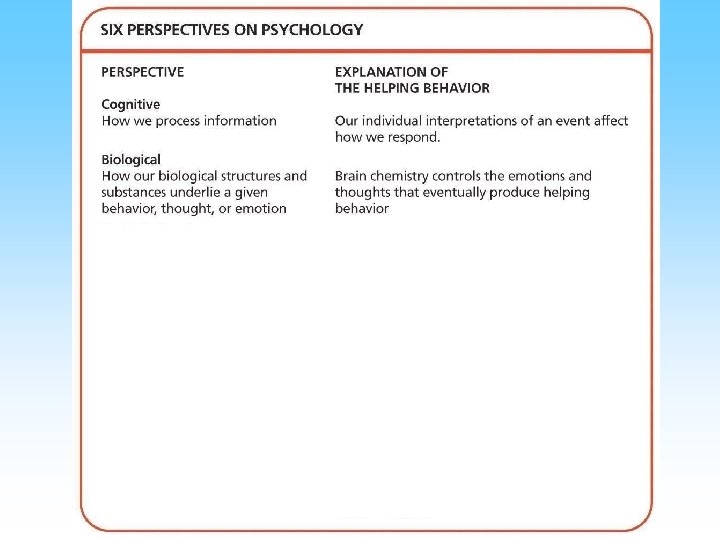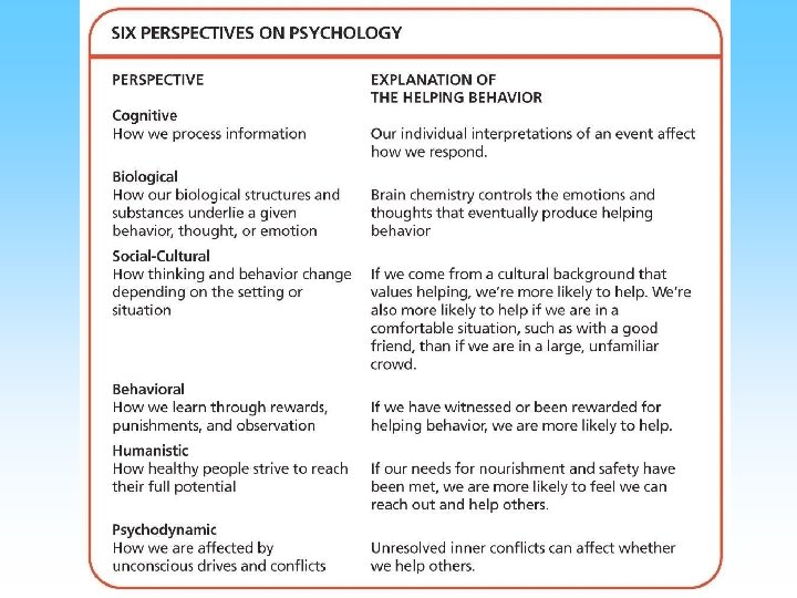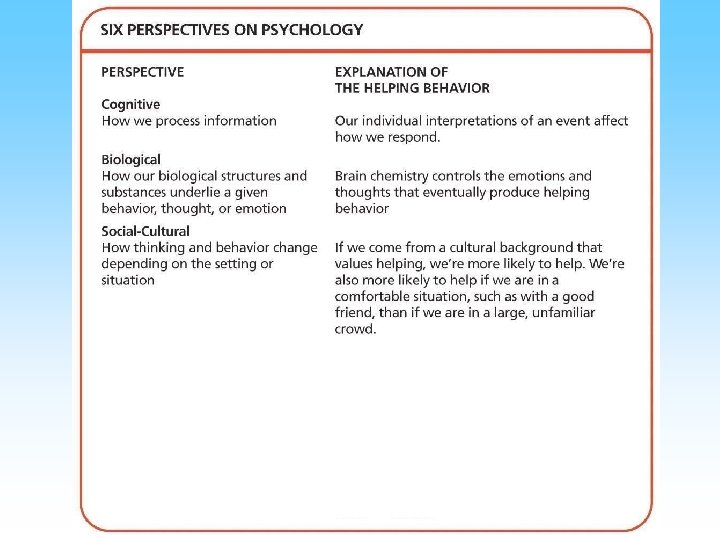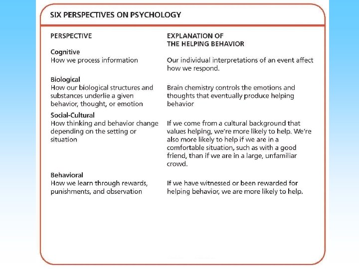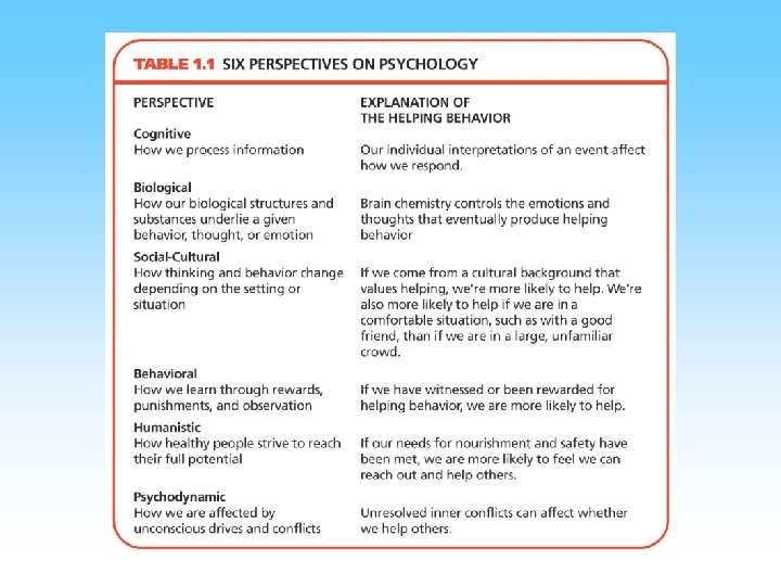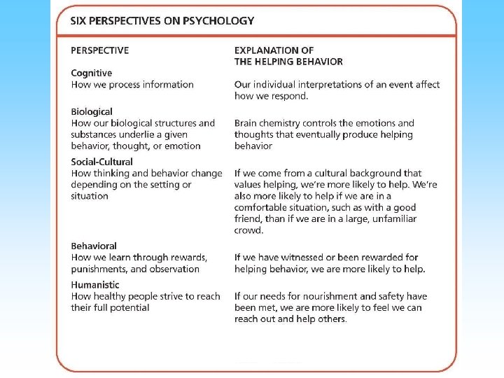 Perspectives • Perspective is a way of viewing phenomena • Psychology has multiple perspectives – – – – Biological Psychodynamic Behavioral Humanistic Cognitive Cross Cultural Evolutionary