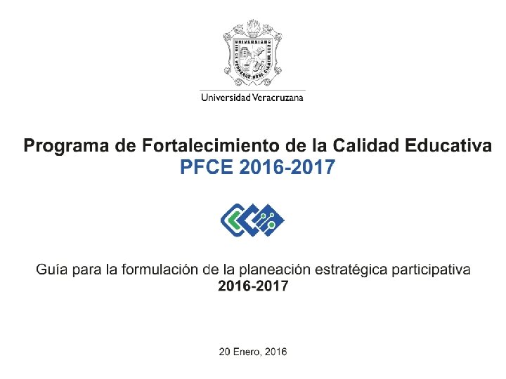 Fechas 27 de Diciembre Acuerdo de la SEP. Reglas de Operación del PFCE 2016 -2017 18 de Enero Recepción de la “Guía para la formulación de la planeación estratégica participativa 2016 -2017” 20 de Enero Inicio del proceso Segunda quincena de Febrero Fecha de entrega del PFCE 2016 -2017