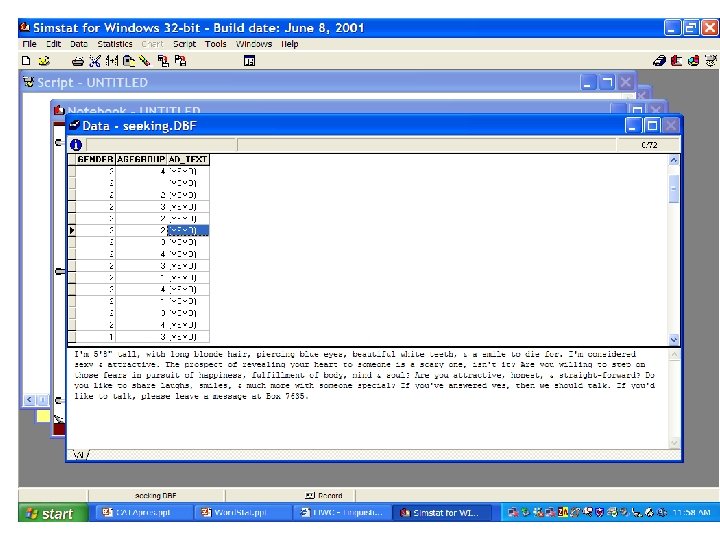 Purposes of CATA p 1. Descriptive—e. g. , word counts n Modell project, using: p p VBPro, M. Mark Miller, 1980 s software 2. Coding of Open-ended Survey Responses n Word. Stat, Sim. Stat adjunct program p (Provalis Research; Normand Peladeau)