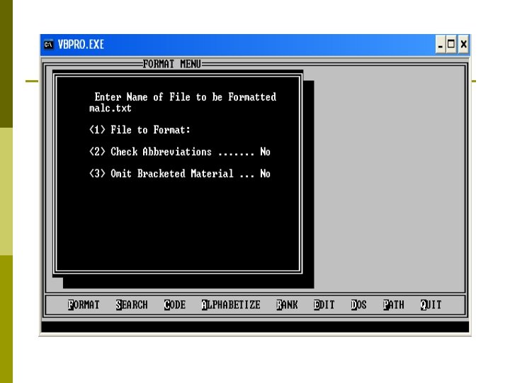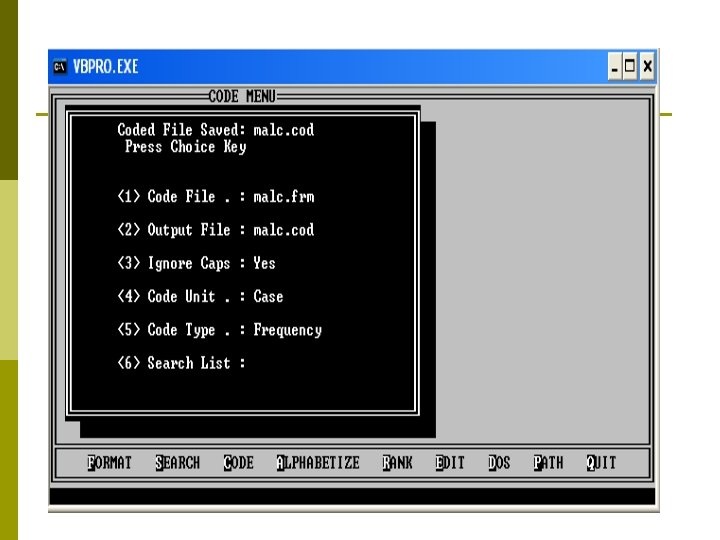 About VBPro p p p Created by M. Mark Miller at the University of Tennessee For use with MS-DOS (!!) Entirely do-it-yourself. . . no standard dictionaries Quantitative: frequencies & coding texts in numeric format for analysis in statistical software Qualitative: can provide KWIC (key word in context)