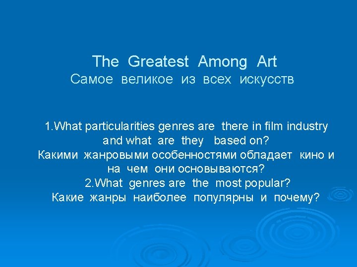 Conclusions Watching films we don’t think about genres We want to relax, to digress of our problems , to enjoy , to cheer up, to laugh, to learn more, to compare book with film and so on…. . Film Аrt is long, life is short» and YOU MUST …? (think!!!) We understand «