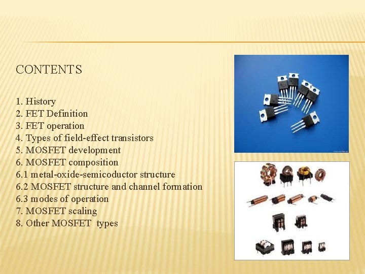 CONTENTS 1. History 2. FET Definition 3. FET operation 4. Types of field-effect transistors 5. MOSFET development 6. MOSFET composition 6. 1 metal-oxide-semicoductor structure 6. 2 MOSFET structure and channel formation 6. 3 modes of operation 7. MOSFET scaling 8. Other MOSFET types
