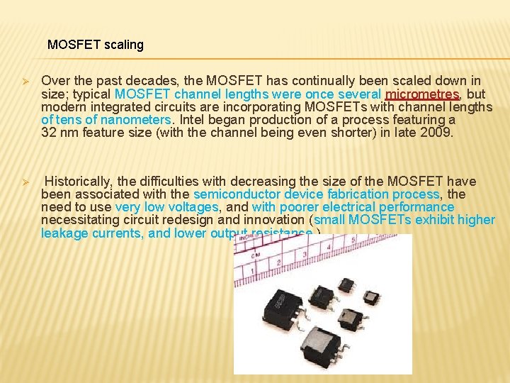 MOSFET scaling Ø Over the past decades, the MOSFET has continually been scaled down in size; typical MOSFET channel lengths were once several micrometres, but modern integrated circuits are incorporating MOSFETs with channel lengths of tens of nanometers. Intel began production of a process featuring a 32 nm feature size (with the channel being even shorter) in late 2009. Ø Historically, the difficulties with decreasing the size of the MOSFET have been associated with the semiconductor device fabrication process, the need to use very low voltages, and with poorer electrical performance necessitating circuit redesign and innovation (small MOSFETs exhibit higher leakage currents, and lower output resistance, ).