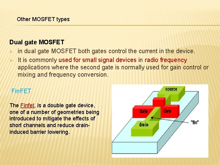 Other MOSFET types Dual gate MOSFET Ø in dual gate MOSFET both gates control the current in the device. Ø It is commonly used for small signal devices in radio frequency applications where the second gate is normally used for gain control or mixing and frequency conversion. Fin. FET The Finfet, is a double gate device, one of a number of geometries being introduced to mitigate the effects of short channels and reduce draininduced barrier lowering.