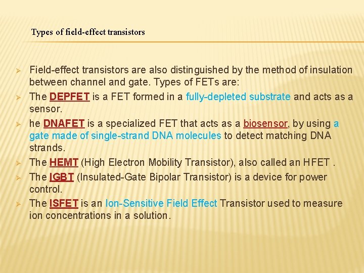Types of field-effect transistors Ø Ø Ø Field-effect transistors are also distinguished by the method of insulation between channel and gate. Types of FETs are: The DEPFET is a FET formed in a fully-depleted substrate and acts as a sensor. he DNAFET is a specialized FET that acts as a biosensor, by using a gate made of single-strand DNA molecules to detect matching DNA strands. The HEMT (High Electron Mobility Transistor), also called an HFET. The IGBT (Insulated-Gate Bipolar Transistor) is a device for power control. The ISFET is an Ion-Sensitive Field Effect Transistor used to measure ion concentrations in a solution.