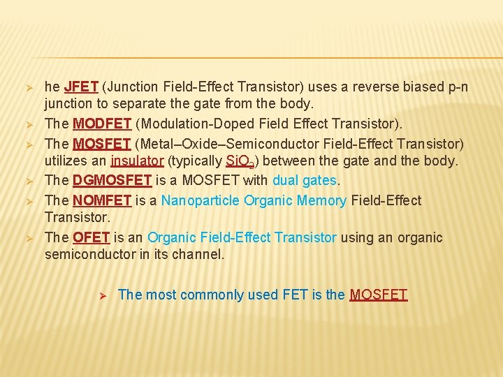 Ø Ø Ø he JFET (Junction Field-Effect Transistor) uses a reverse biased p-n junction to separate the gate from the body. The MODFET (Modulation-Doped Field Effect Transistor). The MOSFET (Metal–Oxide–Semiconductor Field-Effect Transistor) utilizes an insulator (typically Si. O 2) between the gate and the body. The DGMOSFET is a MOSFET with dual gates. The NOMFET is a Nanoparticle Organic Memory Field-Effect Transistor. The OFET is an Organic Field-Effect Transistor using an organic semiconductor in its channel. Ø The most commonly used FET is the MOSFET
