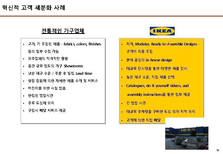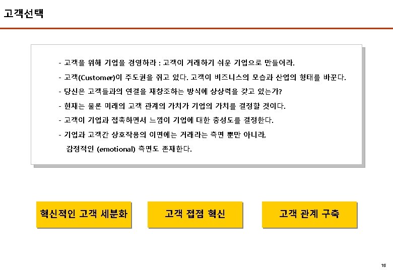 미래를 위한 혁신적인 비즈니스 모델 2006 EMBA 고객 선택 (Customer Selection) Who should I target as customers? 핵심역량 (Core Competence) 가치 네트워크 (Value Network) Which activities do I perform? Which activities do I work with partners? 핵심 전략 (Core Strategy) What products or services should I offer? 14