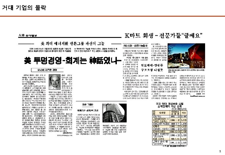 기업의 흥망성쇠 2006 EMBA GE, Kodak, Dupont, 18개 기업 39개 기업 Ford, GM, Exxon, Mobil, P&G, AT&T, Citi Bank 등 100대 기업 82개 기업 Wal-Mart, IBM, HP, Motorola, 3 M, Intel, Boeing, Walt Disney, Xerox 1917년 1987년 9