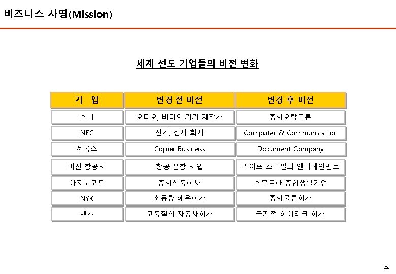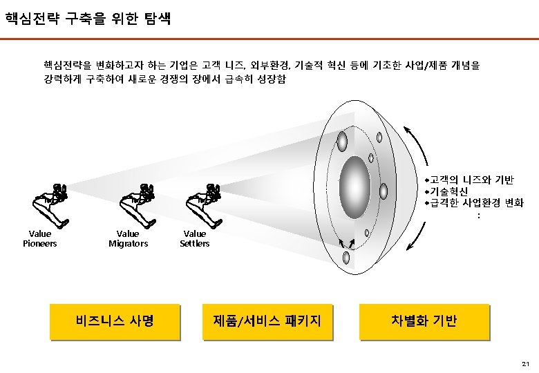 미래를 위한 혁신적인 비즈니스 모델 2006 EMBA 고객 선택 (Customer Selection) Who should I target as customers? 핵심역량 (Core Competence) 가치 네트워크 (Value Network) Which activities do I perform? Which activities do I work with partners? 핵심 전략 (Core Strategy) What products or services should I offer? 20
