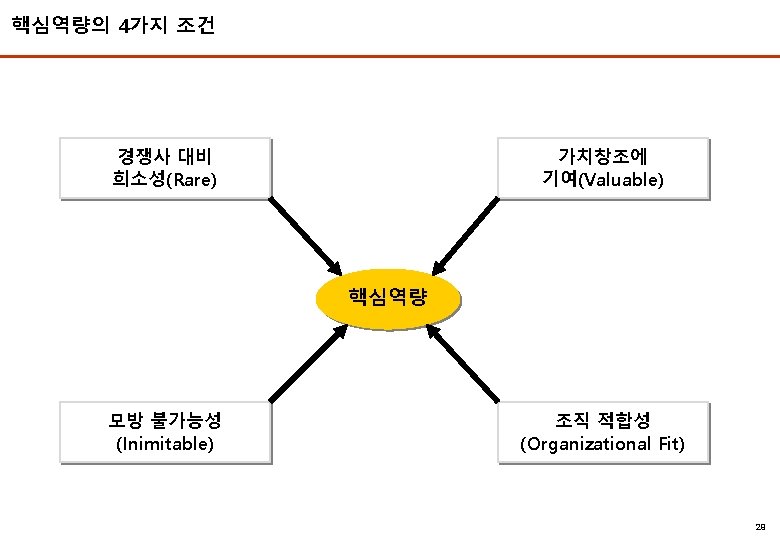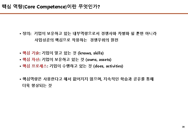 미래를 위한 혁신적인 비즈니스 모델 2006 EMBA 고객 선택 (Customer Selection) Who should I target as customers? 핵심역량 (Core Competence) 가치 네트워크 (Value Network) Which activities do I perform? Which activities do I work with partners? 핵심 전략 (Core Strategy) What products or services should I offer? 27